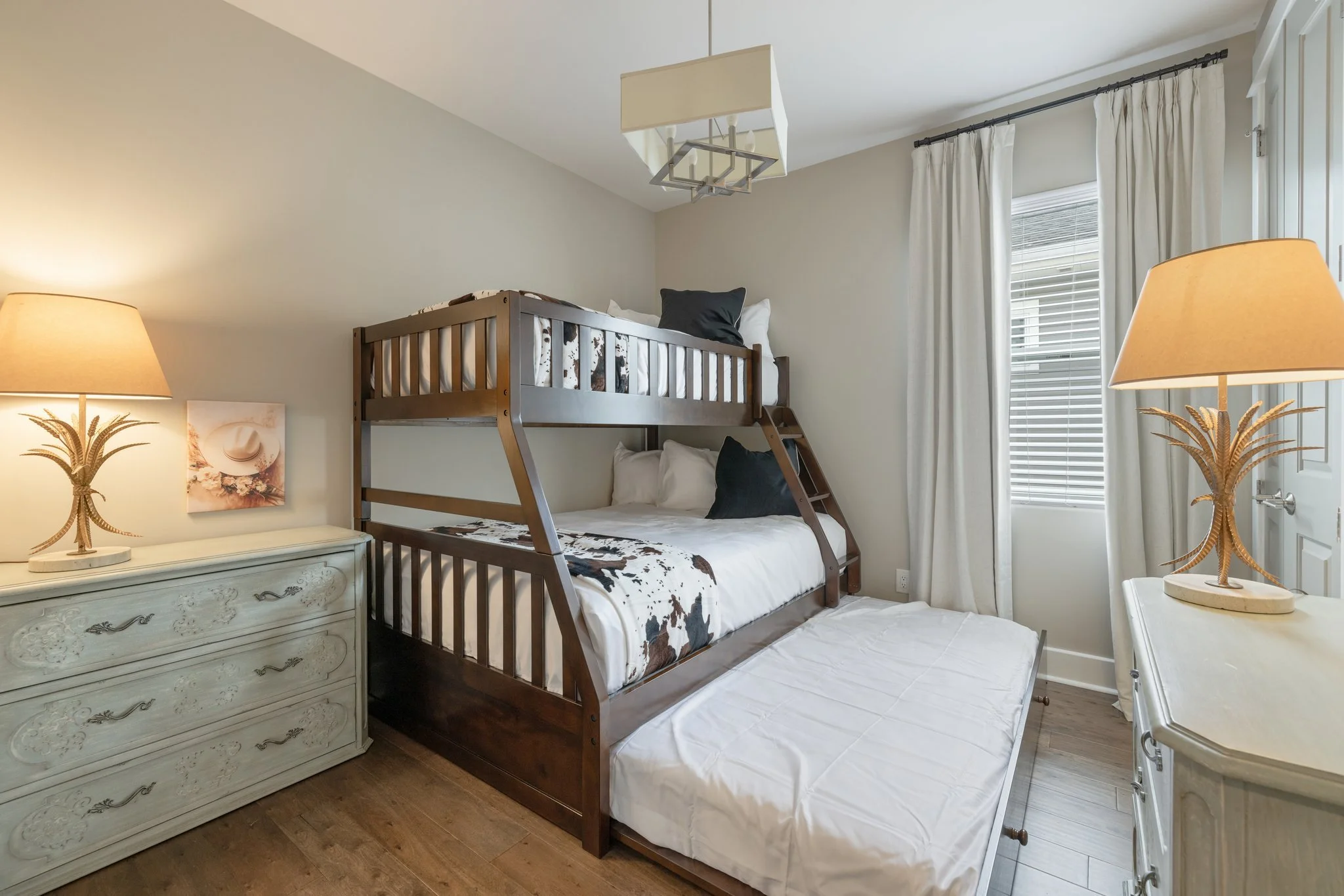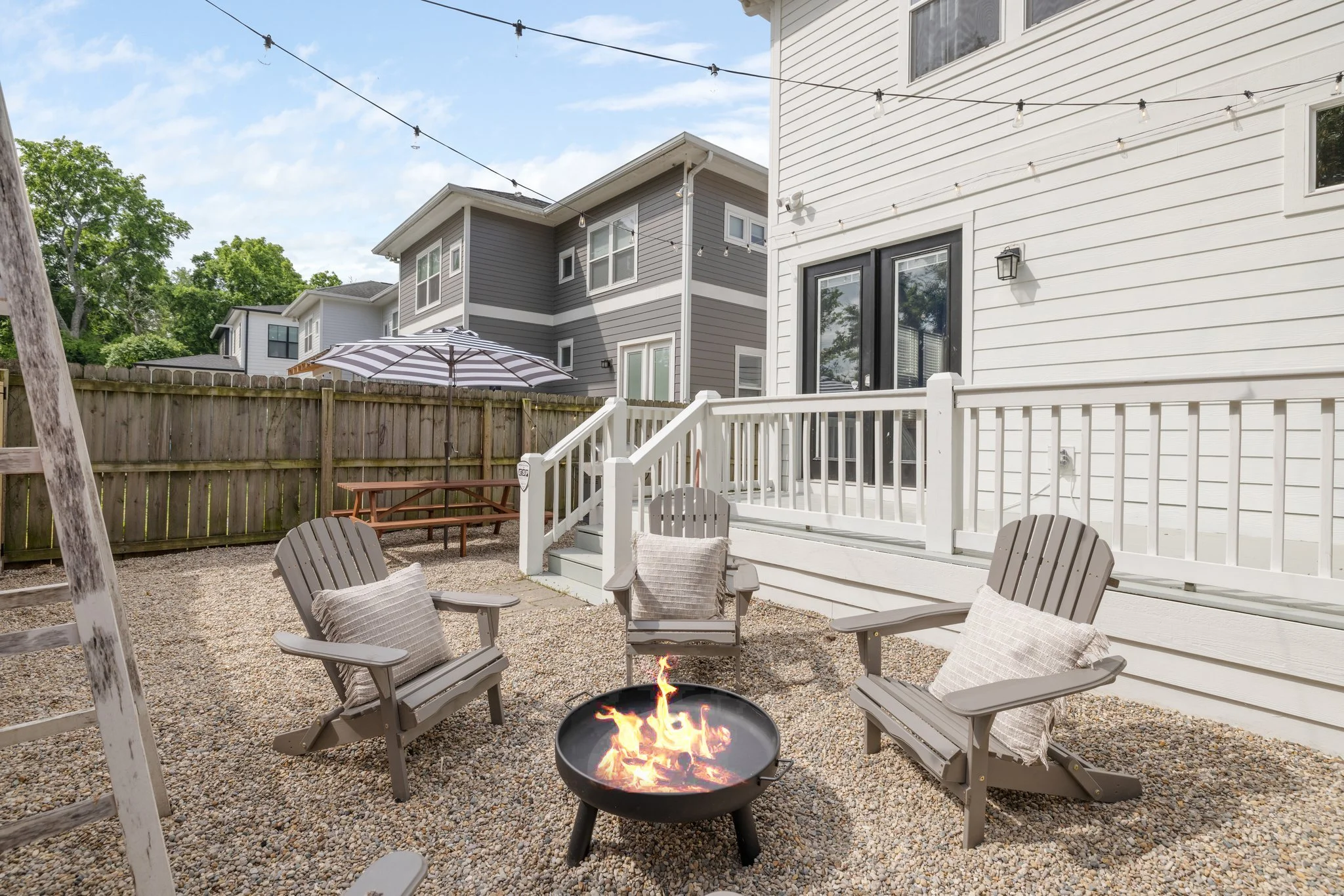Three bedrooms. Two and a half bathrooms. Two covered porches. Front and back social areas. Front courtyard. Back porch. Fire pit. Games.